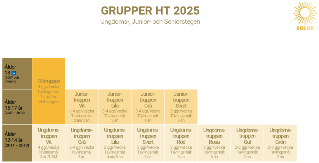 Åldersindelning sker i enlighet med Gymnastikförbundets uppdelning av åldrar inom truppgymnastik.