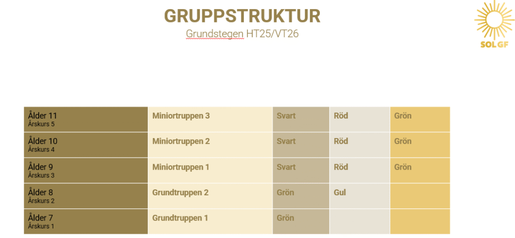 I mån av plats kan alla barn som vill bli placerade i grön trupp. Här tränar vi på gymnastikens grundläggande övningar & ordförråd, att vänta på sin tur, strömma och tävla för första gången. För att träna i de svarta och röda trupperna finns förkunskapskrav då lagen tävlar på en mer avancerad nivå.